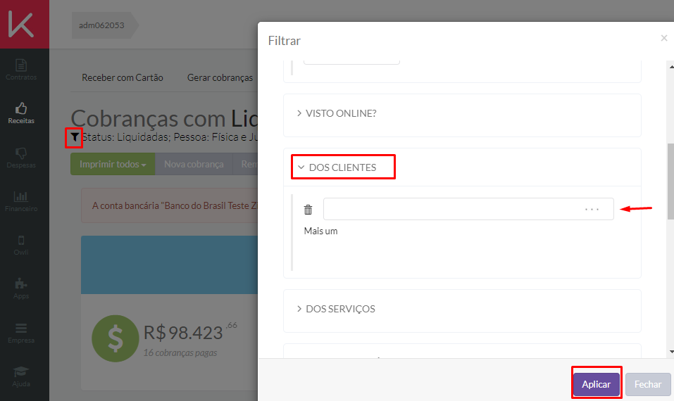 2. Clique no filtro , navegue até a opção Dos clientes, selecione o cliente que deseja visualizar e clique em "Aplicar".