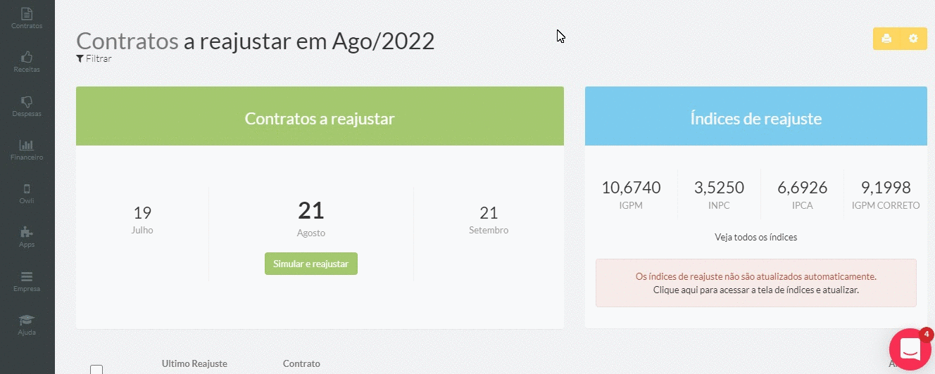 2. Dentro do quadro de resumo do mês, clique sobre o número do contrato que deseja reajustar.