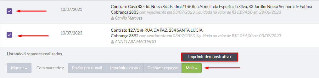 Localize o repasse que deseja imprimir o demonstrativo, marque a caixa de seleção a sua frente e clique em "Mais" > "Imprimir demonstrativo":