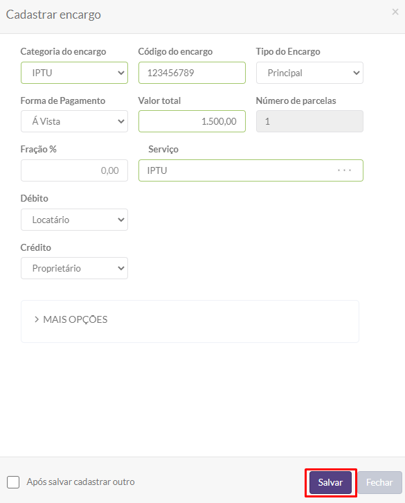 - Em "Mais opções" você poderá indicar se a taxa de administração deverá ser calculada sobre o valor do serviço ou se o encargo não será administrado pela imobiliária, apenas registrado.