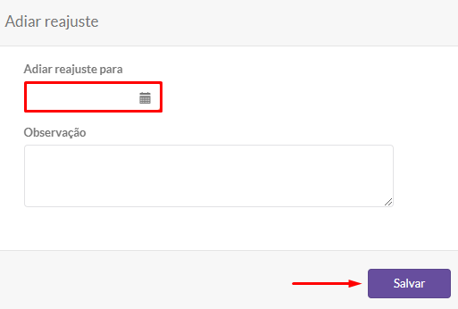 - Na próxima tela, escolha a data em que deseja realizar o reajuste e, se julgar necessário, inclua uma observação.