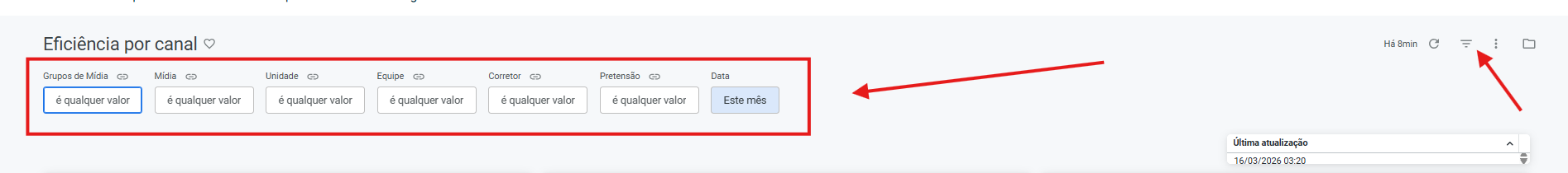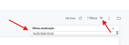 Esse indicador de "Última atualização" mostra a última vez que a base dos dados foi atualizada. E logo acima à direita, você encontra o campo de filtros que fica oculto, ficando visível após clicar no campo indicado.