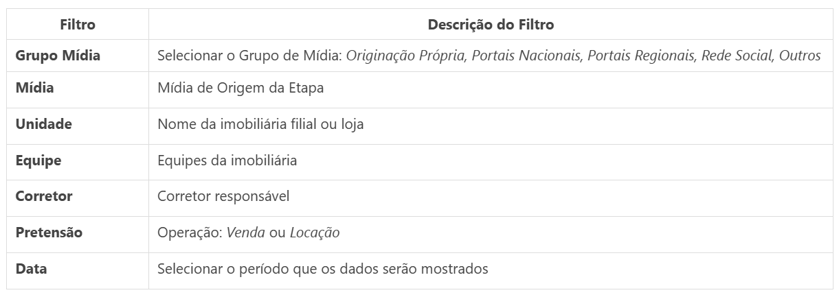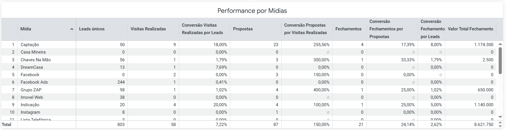 Este campo do painel exibe os dados da visão geral em uma tabela consolidada por Mídias. Nesta tabela, as imobiliárias podem acompanhar os resultados das mídias em relação à quantidade de leads, visitas, propostas, fechamentos e o valor geral de fechamento (venda ou locação). Além disso, é possível visualizar o percentual de conversão em cada etapa do processo de venda ou locação por meio das mídias utilizadas.