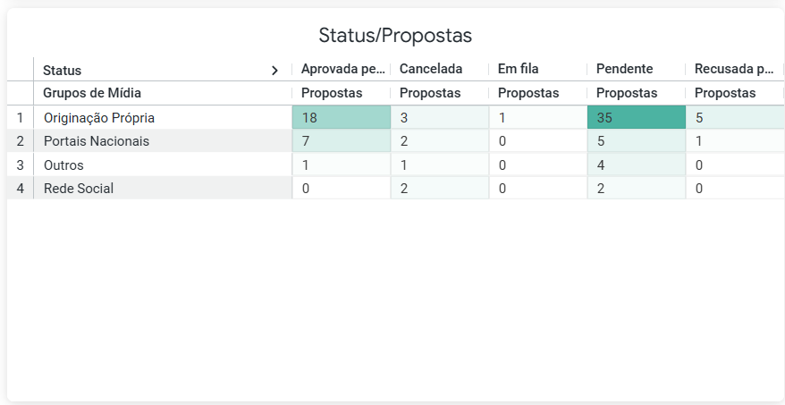 Apresenta a quantidade de Propostas com seus respectivos status agrupadas por Grupo de Mídia