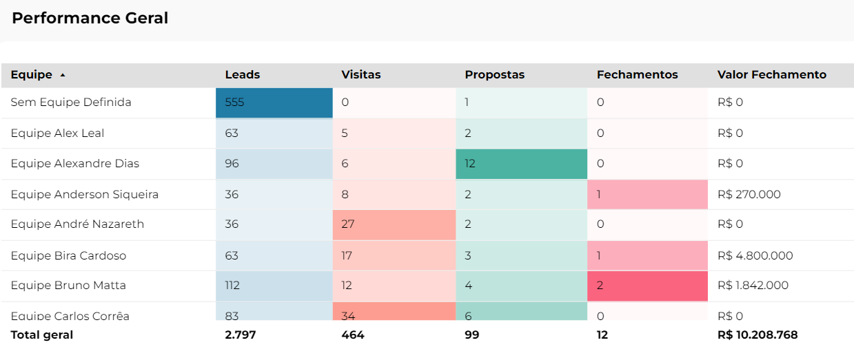 Este campo do painel mostra os dados da visão geral em uma tabela consolidada por Equipe. Nesta tabela será possível que as imobiliárias acompanhem os resultados das equipes mensalmente, dando ênfase na equipe que obteve mais fechamentos dentro do período selecionado.