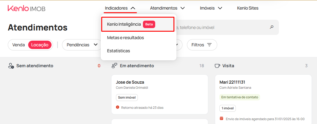 1 - Acesse o menu superior Indicadores > Kenlo Inteligência