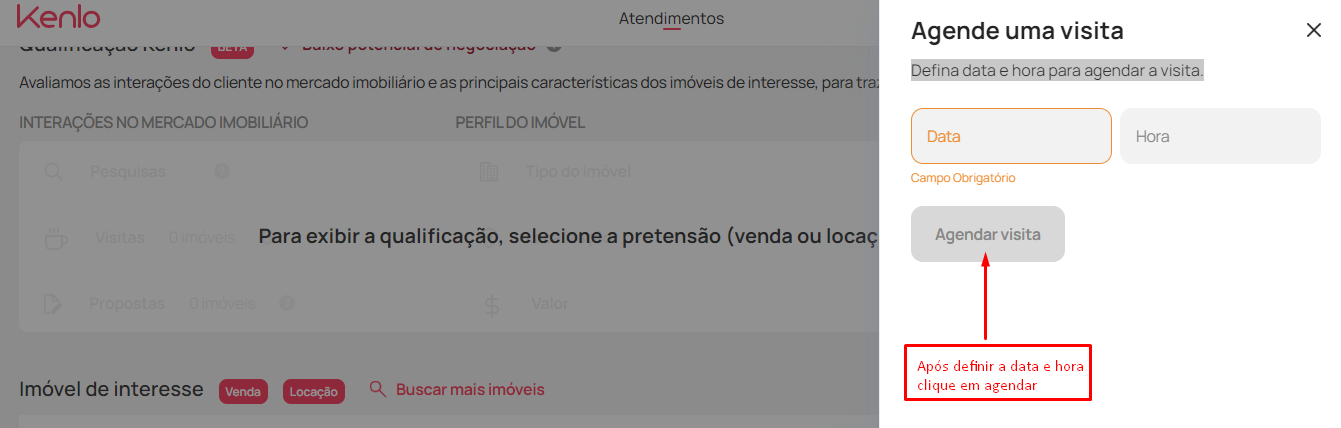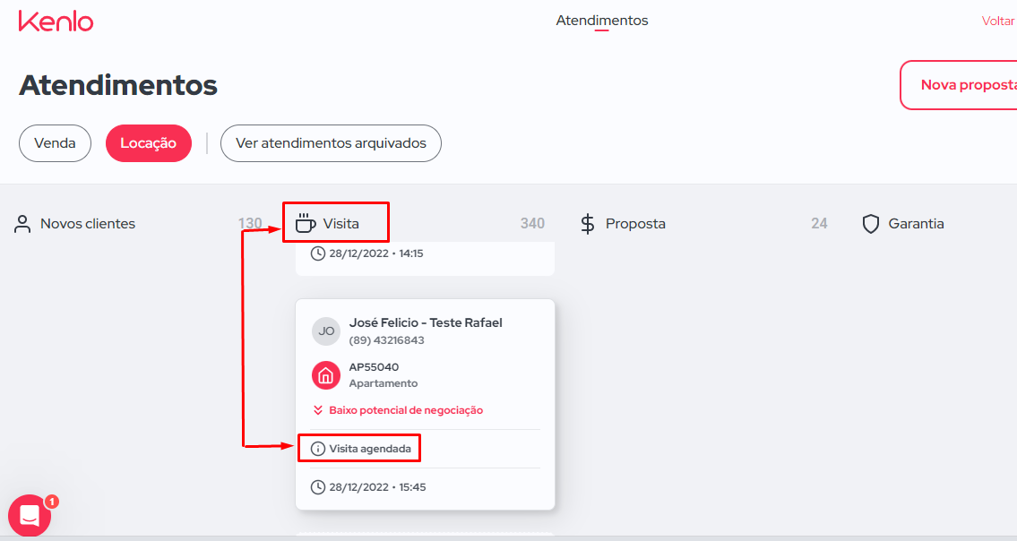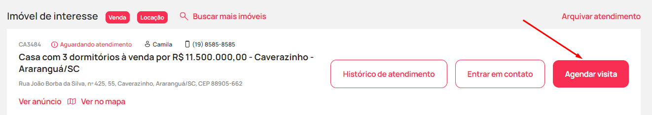 - Após realizar o primeiro atendimento e agendar a visita ao imóvel, encaminhamos o atendimento para a seção de "Visitas". Dessa forma, garantimos que a equipe responsável tenha o controle e acompanhamento necessários para assegurar o êxito da visita e da negociação: