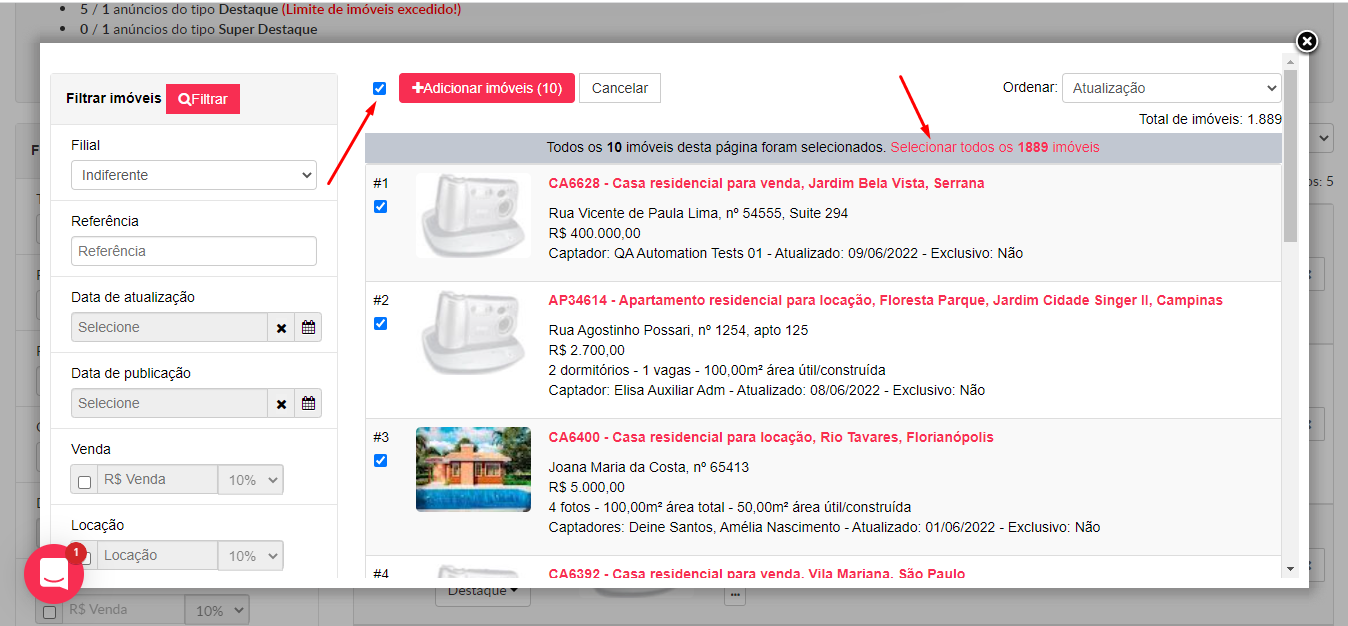 5 - Clique para selecionar os imóveis e depois em "Adicionar todos os imóveis":