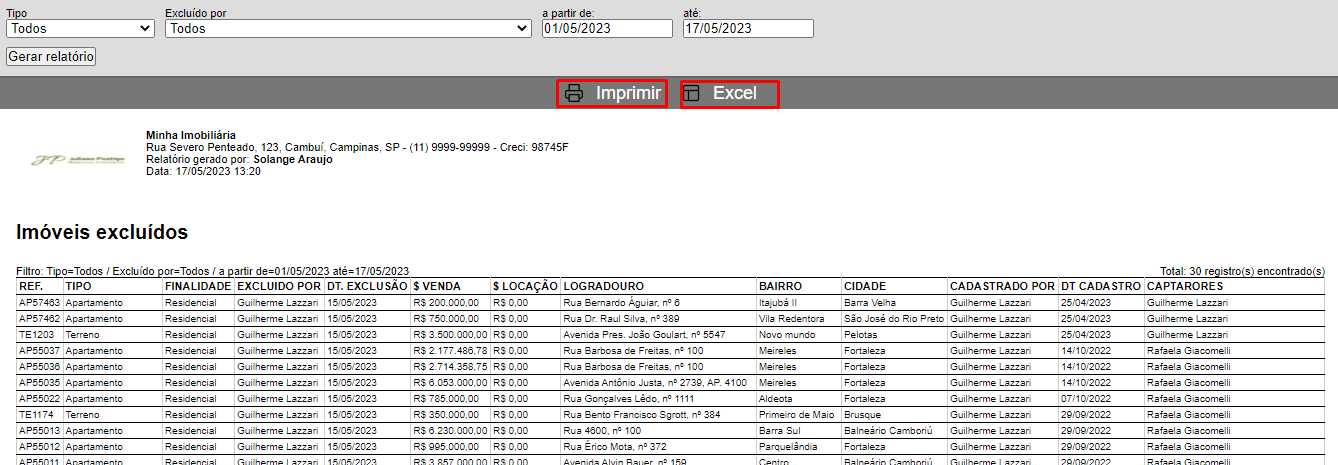 Nome do usuário: o nome do usuário responsável pela exclusão do imóvel.