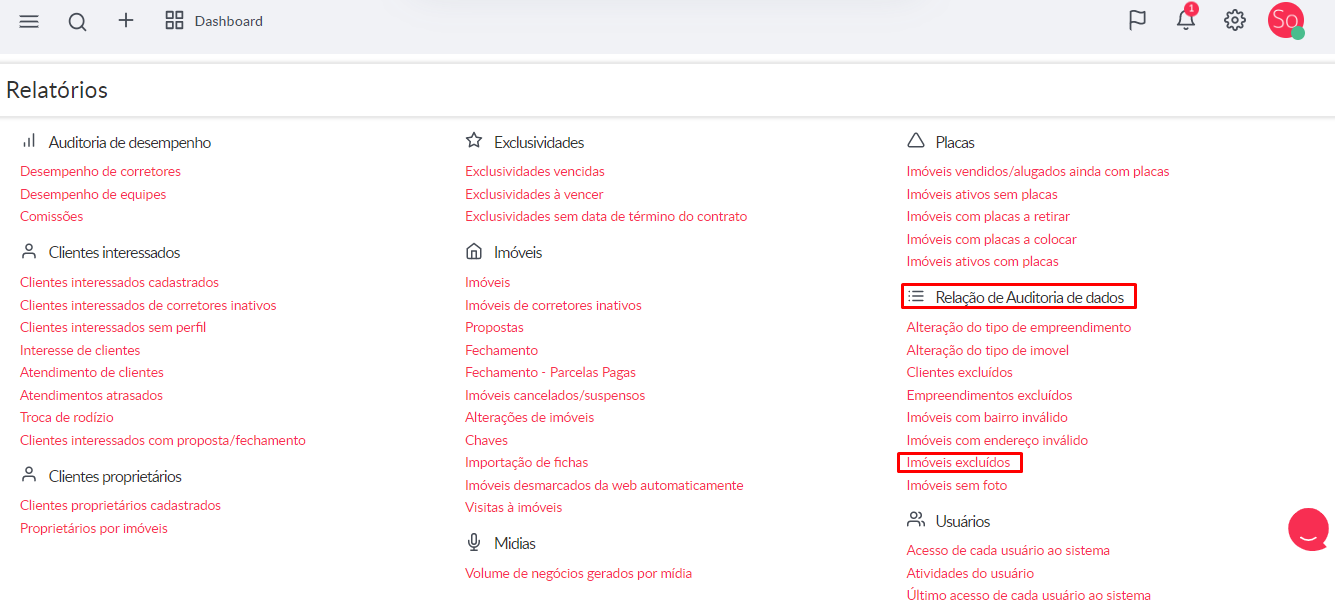 2 - Navegue até a seção seção Relação de Auditoria de dados > Imóveis excluídos