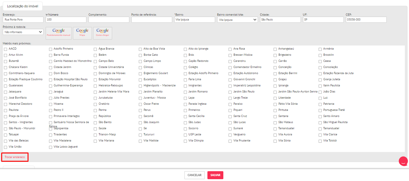 3 - No campo Localização do imóvel clique em "Trocar endereço": ( alguns imóveis dependendo da cidade essa opção aparece logo após a listagem de metrôs):