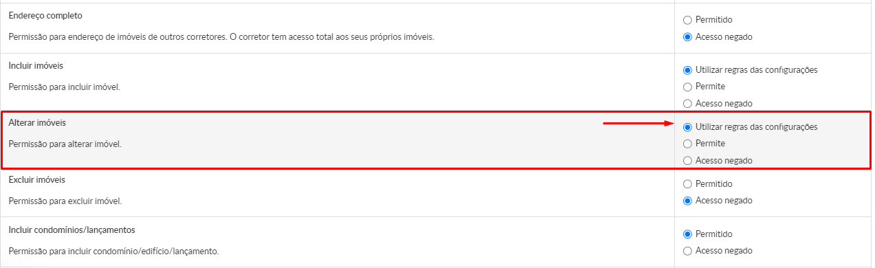 Para que a regra funcione corretamente, é necessário configurar a opção de segurança "Alterar Imóveis" na ficha do perfil/usuário como "Utilizar regras da configuração". Veja como configurar:
