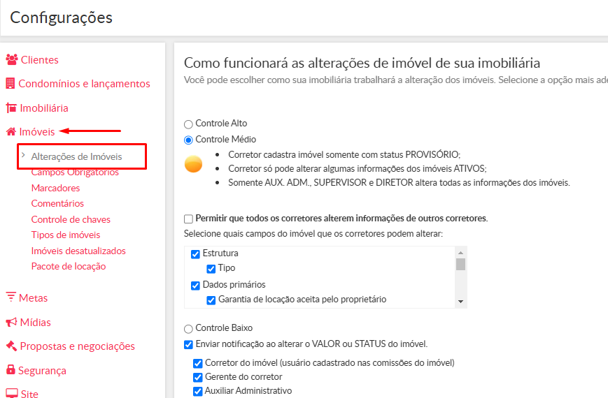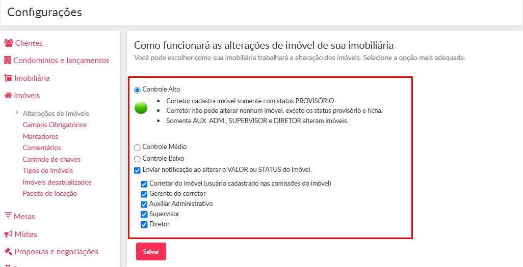 Você ainda poderá configurar quem serão os perfis que receberão um e-mail sempre que o valor ou status do imóvel for alterado.