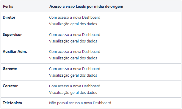 A visualização dos valores do indicador Leads por mídia de origem restringe apenas o perfil Telefonista, não possuindo acesso a pagina da Dashboard, para os demais perfis, os mesmos possuem acesso e visualização geral dos dados.