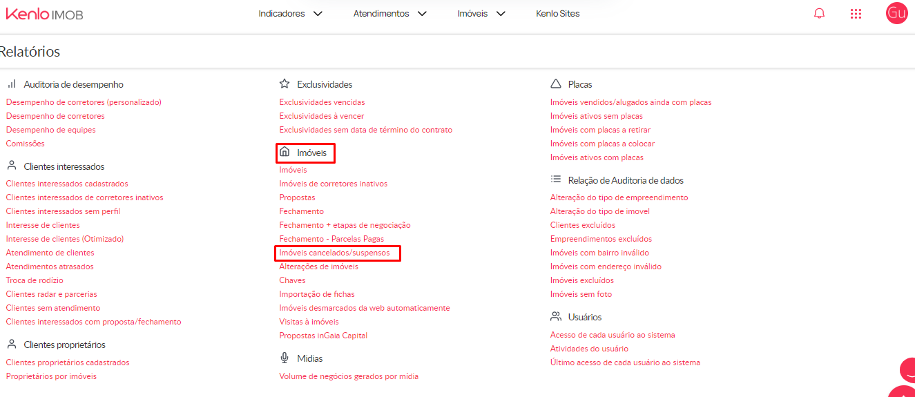 3 - Localize o item Imóveis > Imóveis cancelados/suspensos.