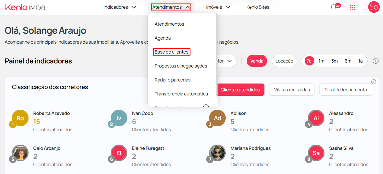 1 - Acesse o menu superior e clique em Atendimentos > Base de clientes