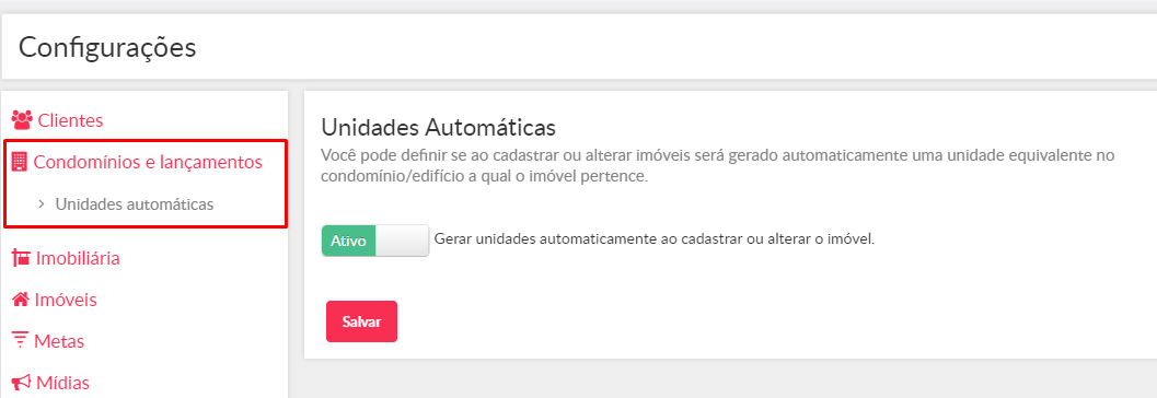 - Regra Ativa: Mantenha a regra ativa se desejar que as unidades sejam criadas automaticamente quando um imóvel for cadastrado ou alterado.