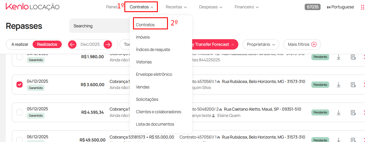 - Acesse o menu "Contratos (1)" > "Contratos (2)" e localize o contrato que deseja modificar:
