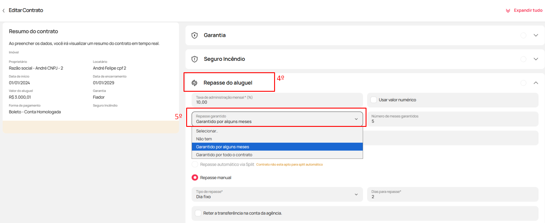 - Siga até a configuração de "Repasse do aluguel (4)" e defina se o repasse será "Garantido por alguns meses" ou "Garantido por todo o contrato" (5).