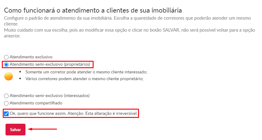 Chegou a hora de configurar o padrão de atendimento de sua imobiliária, escolhendo a quantidade de corretores que poderão atender um mesmo cliente. Muito cuidado com sua escolha, pois ao modificar essa opção e clicar no botão SALVAR, não será possível voltar para a opção anterior.