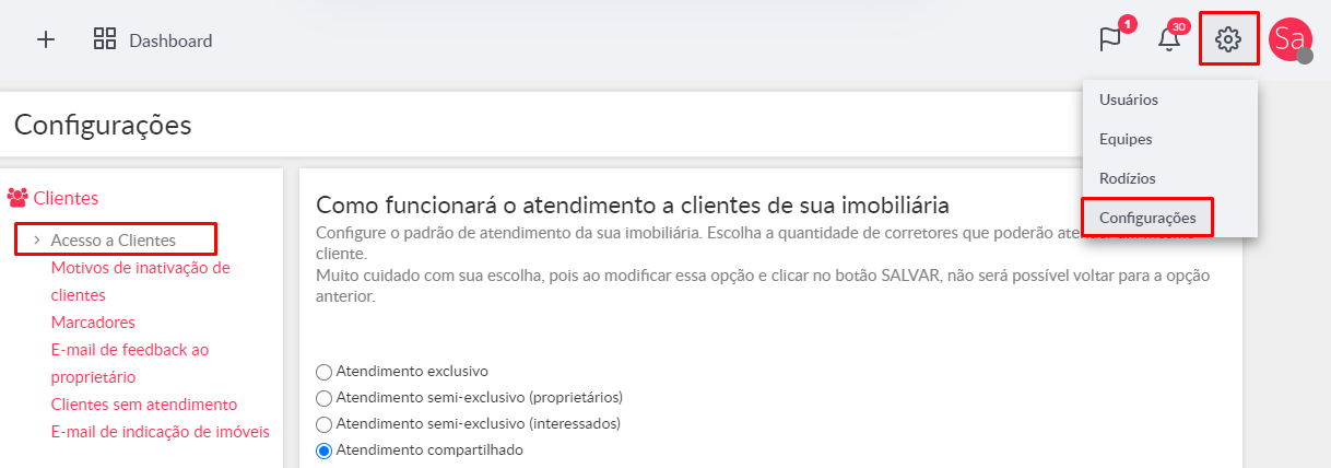 1 - Com perfil de Diretor acesse o ícone de engrenagem no canto superior direito da tela inicial do Kenlo Imob e selecione "Configurações" > "Clientes" > "Acesso a Clientes".