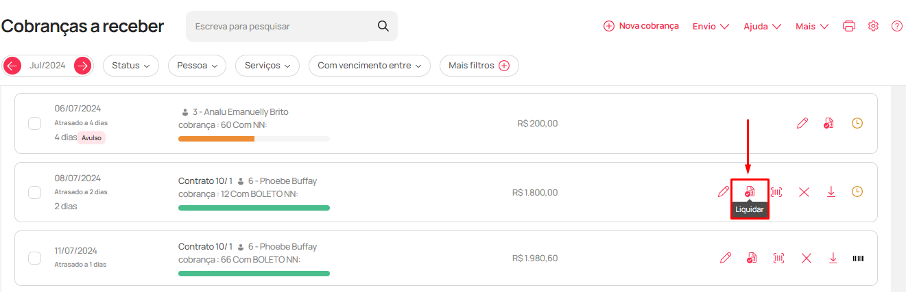 - Localize a cobrança que deseja e, ao lado direito, identifique o ícone de "Liquidar ✅". Clique: