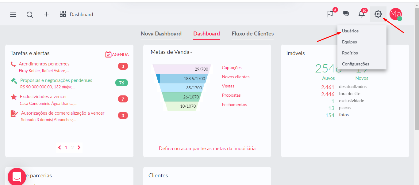 - Acesse o ícone da engrenagem ⚙️ que encontra-se do lado superior direito do sistema, e clique em usuário. Confira a imagem abaixo: