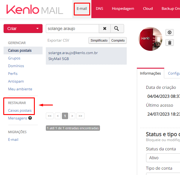 3 - Através da lupa localize o e-mail que deseja realizar a exclusão e clique para abrir as informações gerais