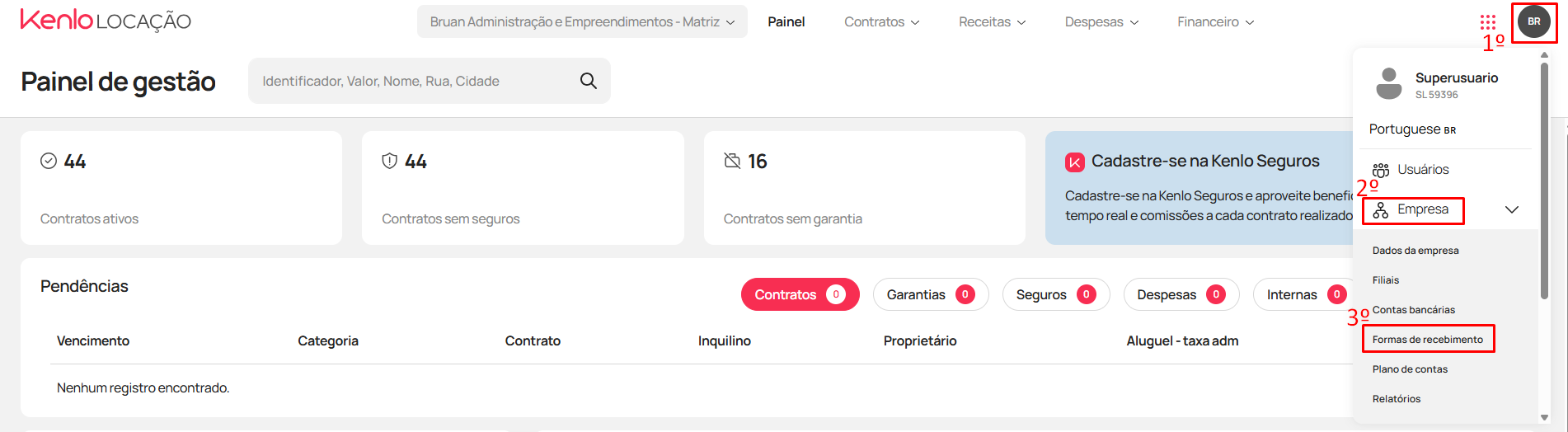 -  Ao abrir o menu, clique em "Empresa" (2) > "Formas de recebimento" (3)