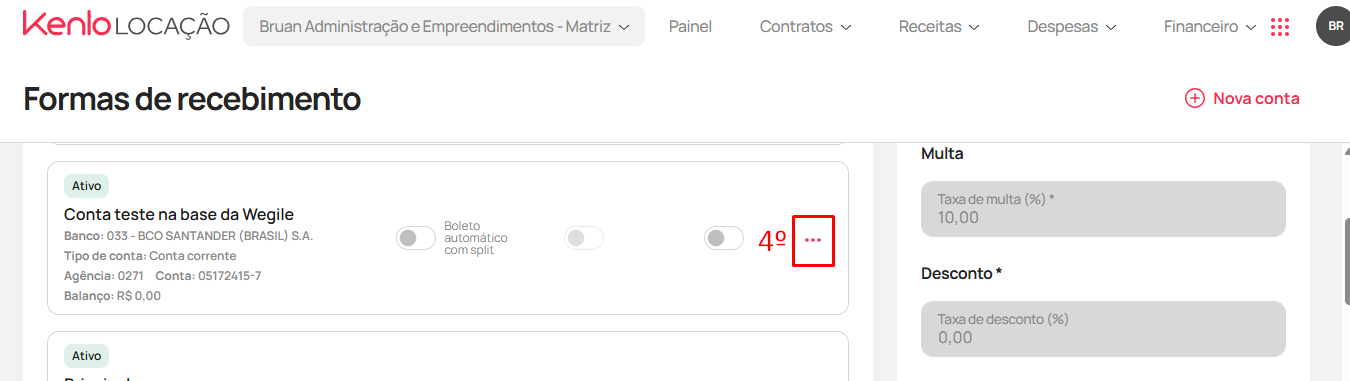 - Ao lado esquerdo, no quadro "Contas bancárias", localize a forma de recebimento que deseja desativar e clique nos pontinhos em vermelho (4)