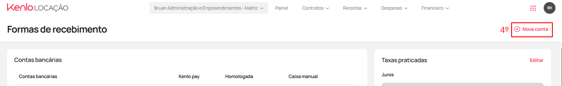 - Passe o mouse sobre as iniciais do seu usuário no canto superior direito da tela, acesse o menu "Empresa" e clique em "Formas de recebimento":