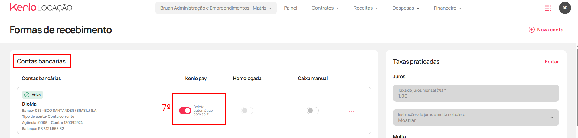 - No quadro "Formas de recebimento" a conta ficará cadastrada. Clique em "Boleto automático com Split"