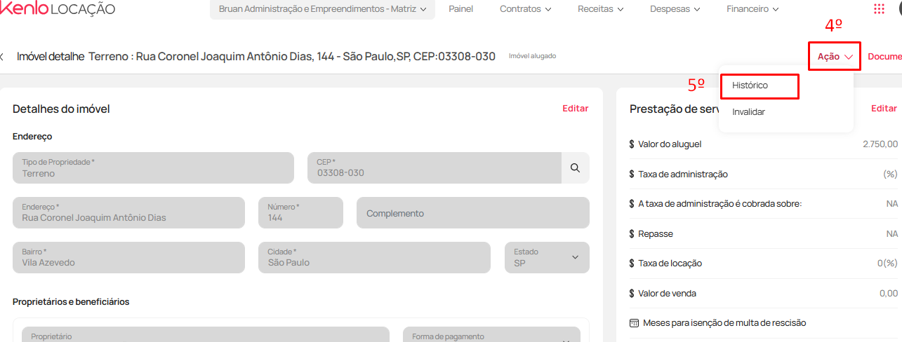 Clique na opção de "Ações (4)" e clique em "Histórico (5) ":