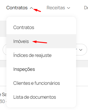 - Acesse o menu "Contratos" (1) > "Imóveis" (2)