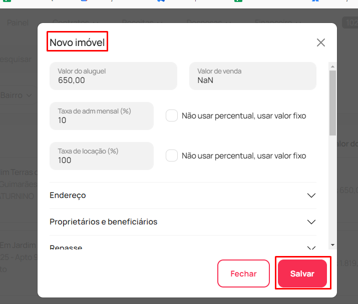 - Clique sobre o ícone de clonagem e uma nova janela será aberta, exibindo as informações do novo imóvel. Nessa janela que você poderá fazer as alterações necessárias.