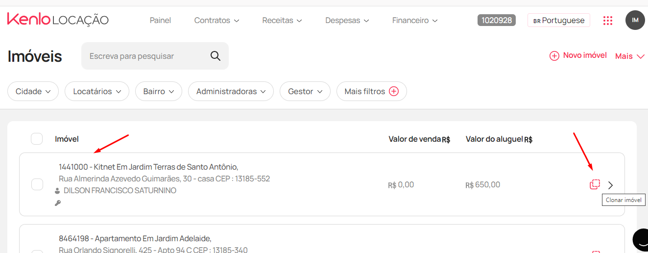 - Localize o imóvel que deseja clonar e passe o mouse sobre ele, você poderá visualizar o ícone de "Clonar" (3)