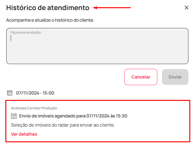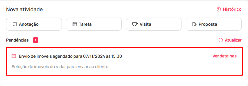- Registro no Histórico do Atendimento: A tarefa é registrada no histórico e listada no quadro de pendências do atendimento.