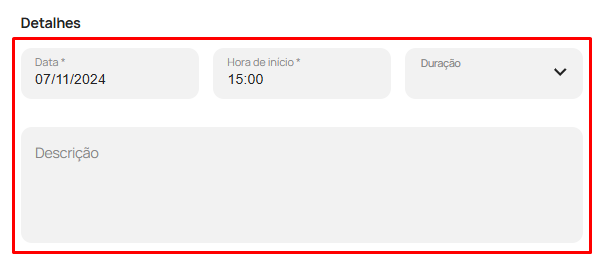 - Preencha as informações da tarefa: data, horário de início e duração. Adicione uma descrição sobre o evento, se achar necessário.