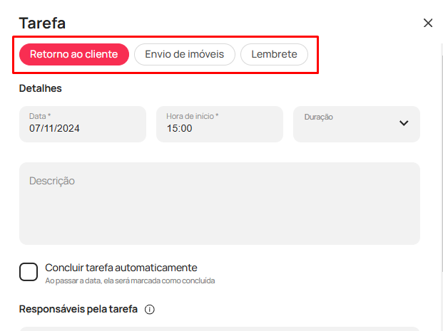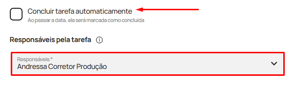 - Depois, informe os responsáveis pela tarefa e defina se ela deve ser concluída automaticamente pelo sistema após o término do horário definido.