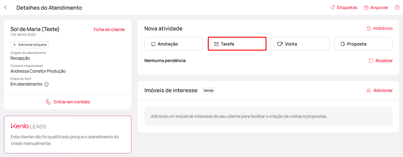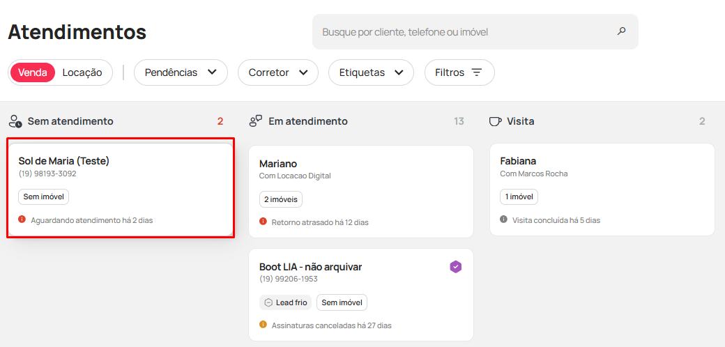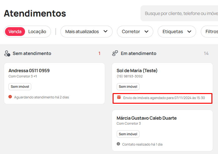 - Ao agendar uma tarefa em um atendimento que está na etapa "Sem atendimento", o sistema reconhecerá como uma atualização e moverá o card para a etapa "Em atendimento".