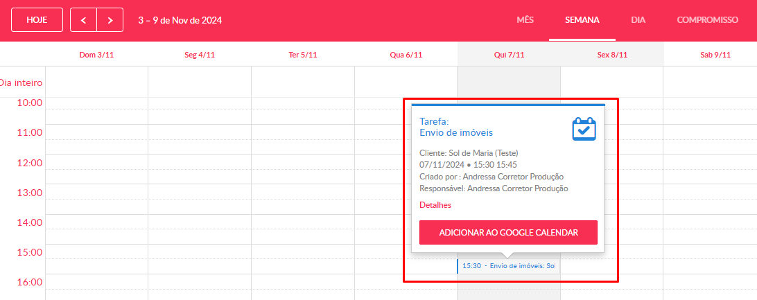 - Criação de Compromisso na Agenda do Imob: A tarefa é automaticamente adicionada como um compromisso na agenda dos responsáveis vinculados a tarefa.