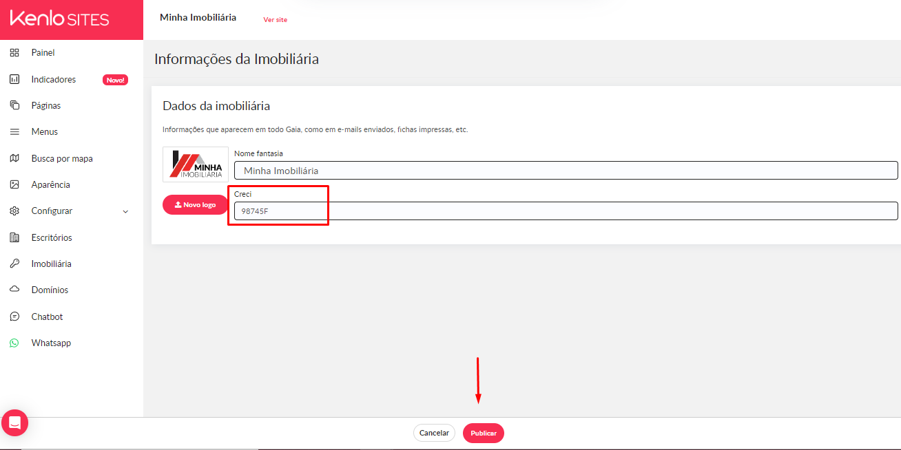 Na página de configurações, você pode incluir ou alterar o número do seu CRECI, que será exibido no rodapé do site. Após fazer as alterações desejadas, clique em "Salvar" para finalizar.