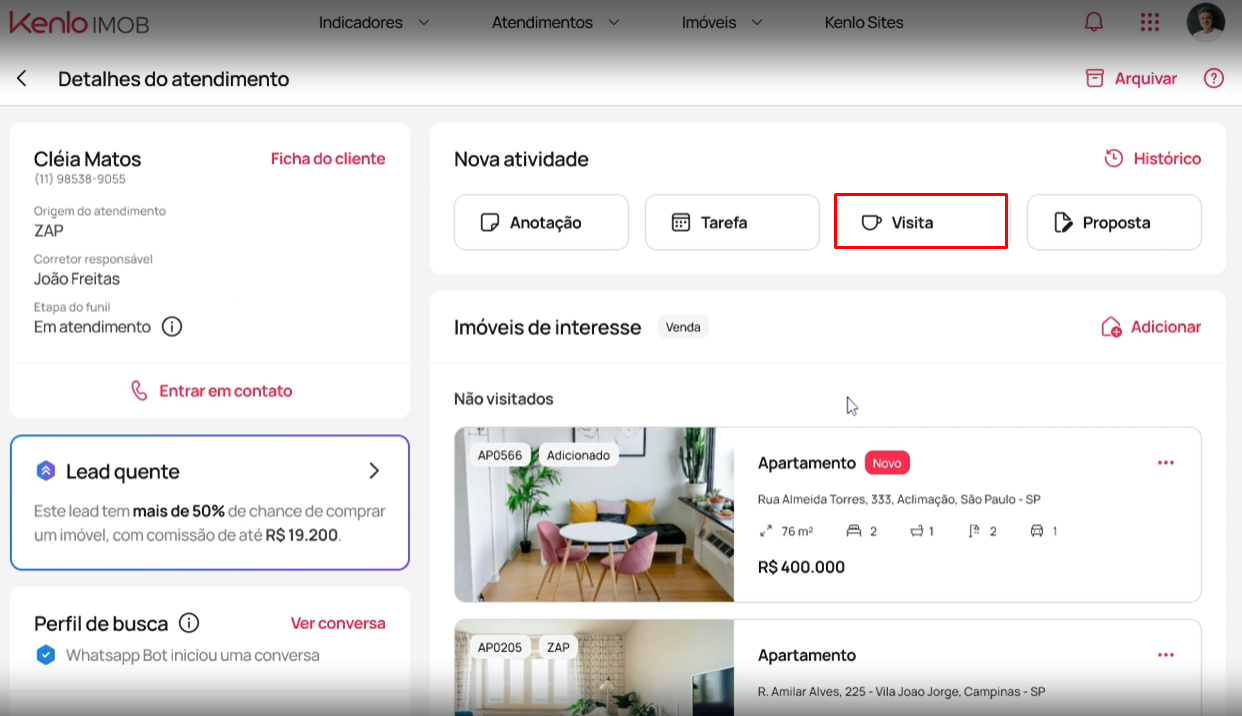 Retornando para detalhes do atendimento é possível visualizar a visita agendada na 'Etapa do funil' e no campo 'Ações pendentes'.