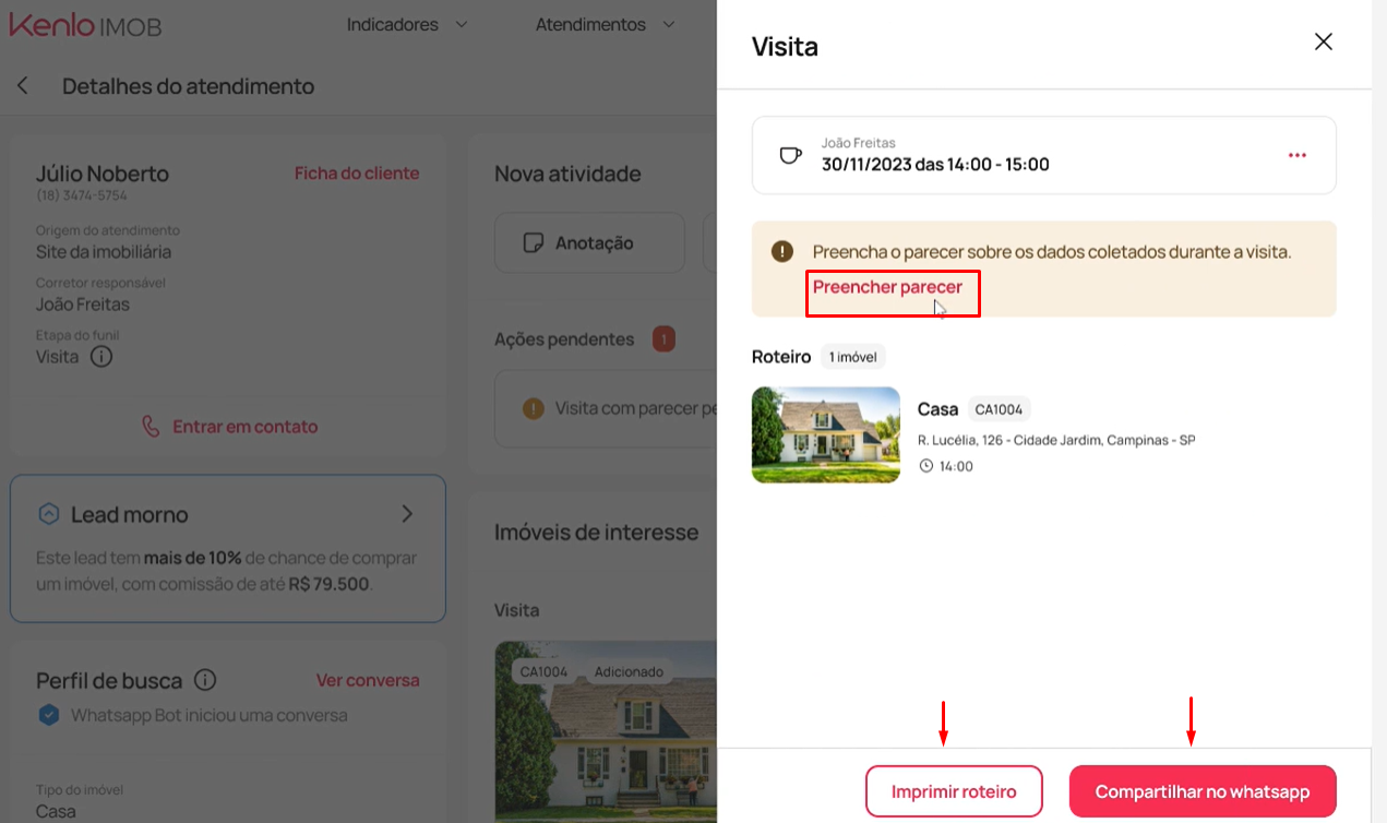 3. Para concluir o processo, preencha o parecer e, em seguida, você terá a opção de compartilhá-lo via WhatsApp ou imprimir o roteiro.
