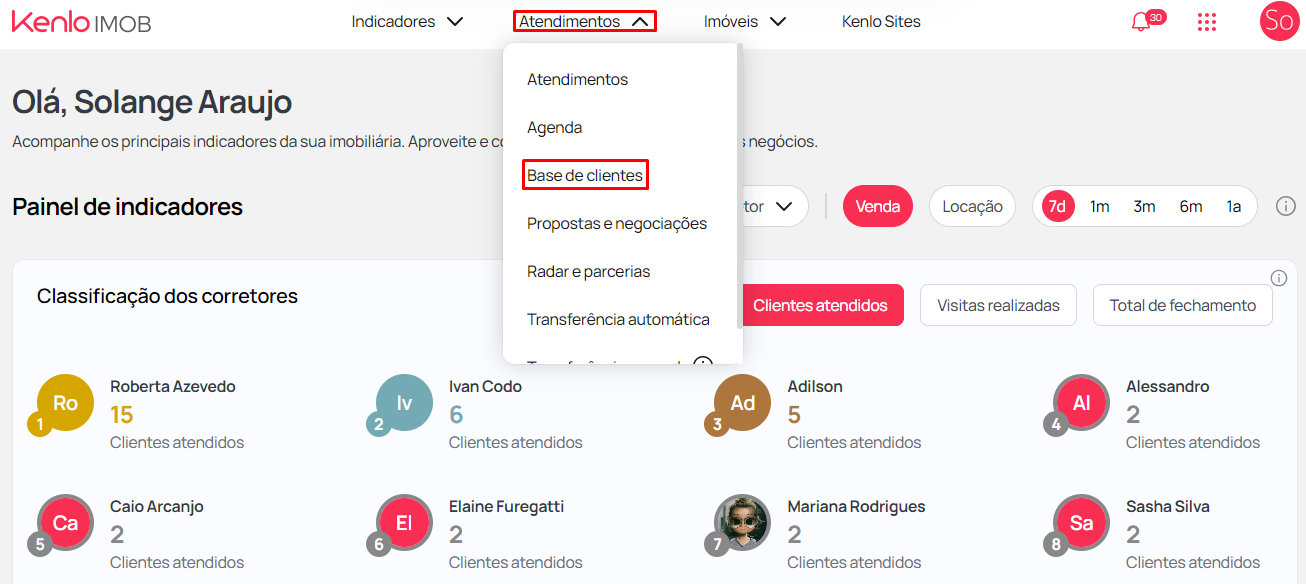 1 - Para começar, vá em "Atendimento" > "Base de clientes" e aguarde a busca de clientes carregar.