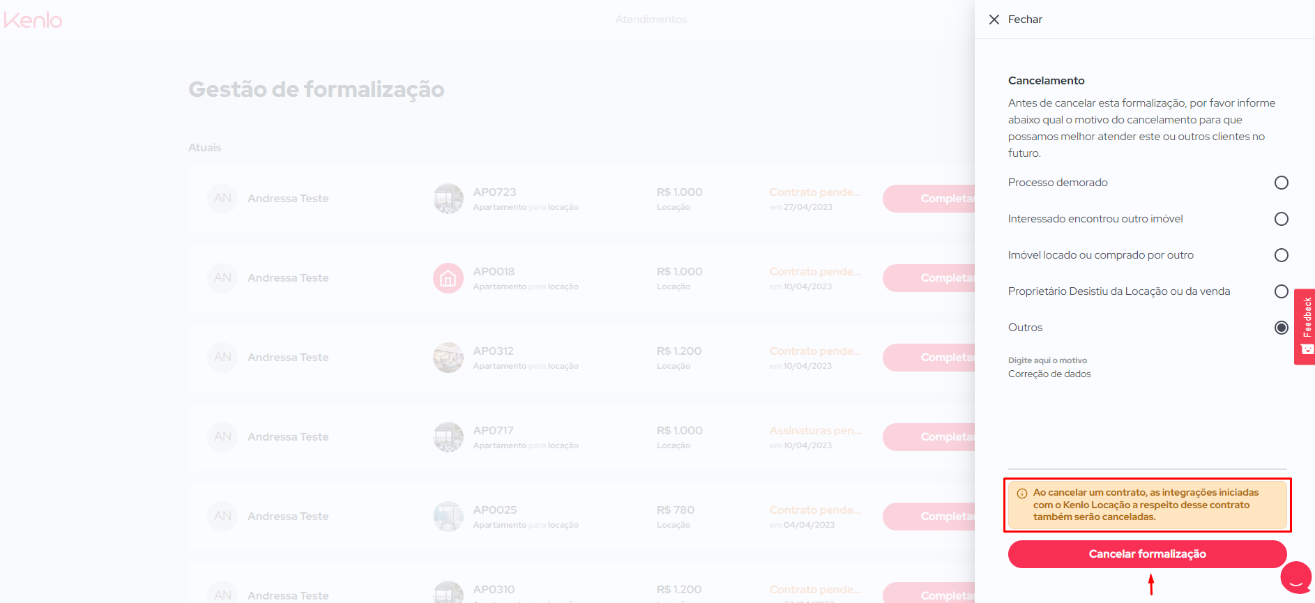 3 - Escolha o motivo do cancelamento e clique em Cancelar Formalização: