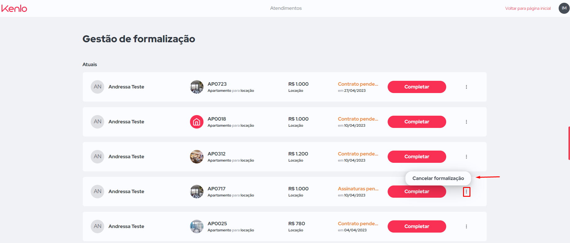 2 - Na tela de Gestão de formalização clique nos 3 pontos e selecione a opção Cancelar formalização: