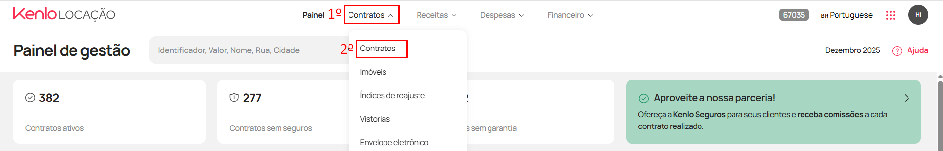 - Acesse o menu "Contratos" (1) > "Contratos" (2)