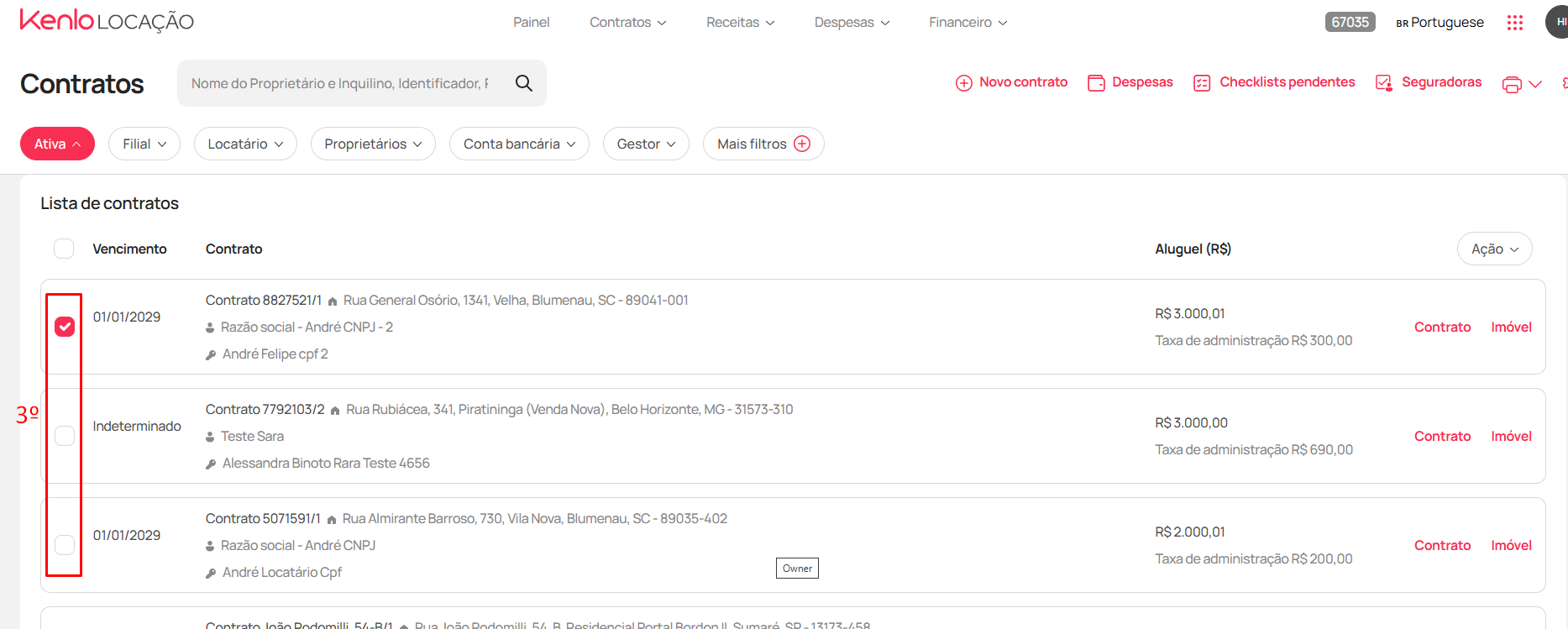 - Localize na " Lista de contratos", quais os contratos que deseja emitir as Notas Fiscais e marque estes contratos utilizando a caixa ao lado esquerdo, um a um. Ao selecionar a caixa altera para a cor vermelha, indicando que o contrato está selecionado (3)