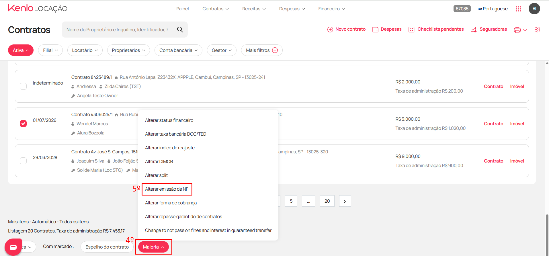 - Após selecionar os contratos. Siga até o final da página e clique em "Maioria" (4) > "Alterar opção de Nota Fiscal" (5)